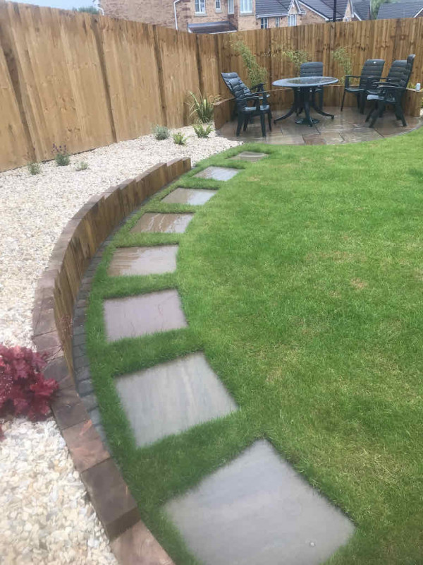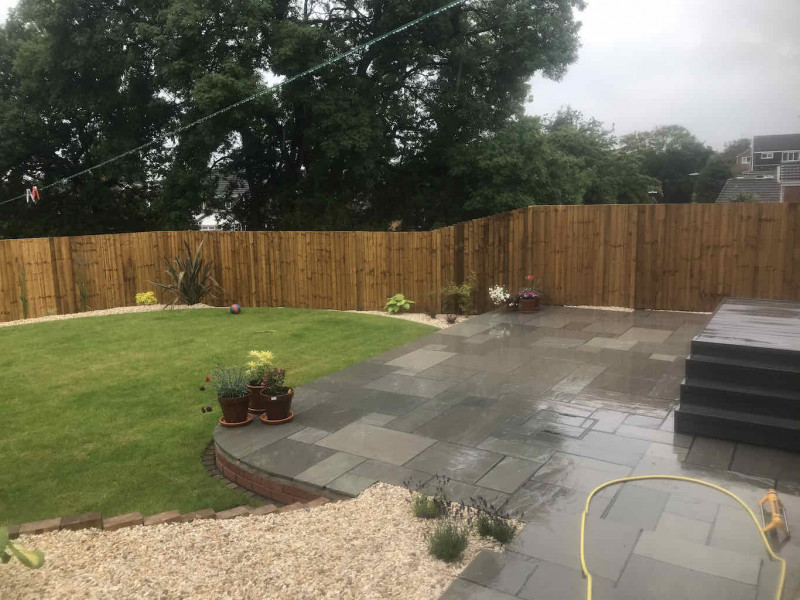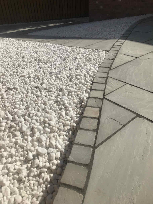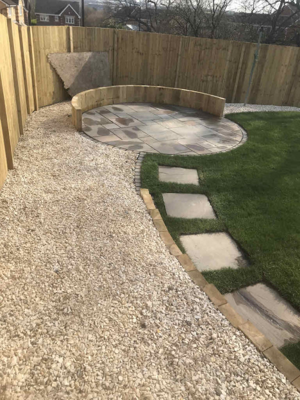 This project involved a substantial area of sandstone paving leading to a circular lawn. Two types of Indian stone were used, Raj Green and Kandala Grey. This provided a visual break among the large area of paving; we also used 4 different sizes of paving (in both colours) to create an informal pattern. Raj Green edging cobbles were used throughout to link the different paving types together.