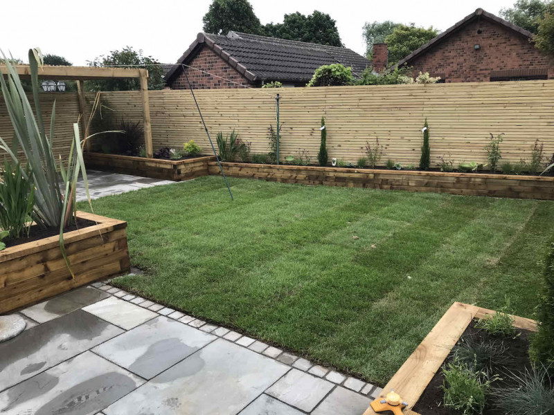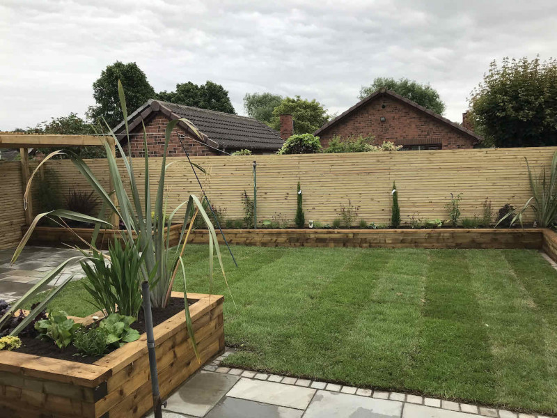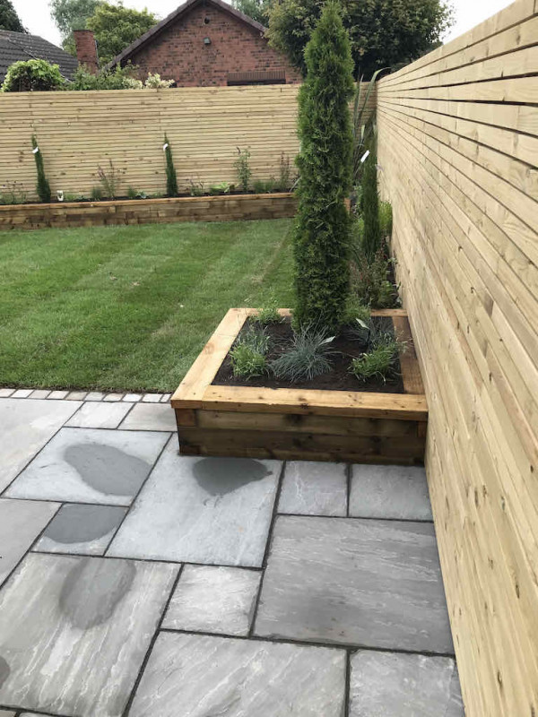 Cedar clad planters add interest and soften the switch from patio to lawned area. They were filled with carefully selected planting to give height and add depth to the garden as they grow.