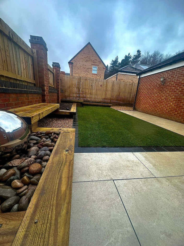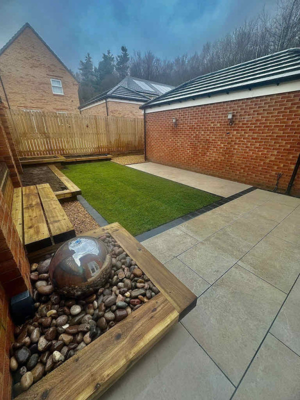 A spherical polished stainless steel water feature nestles on a bed of stones inside one of the newly created planters. This adds a tranquil background feel to the whole garden and provides a more contemporary touch. The customers were very happy with the end result!