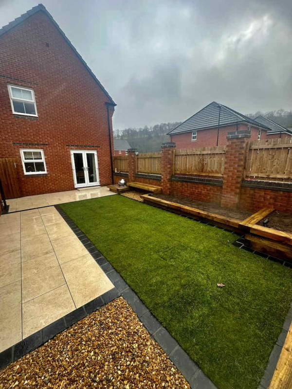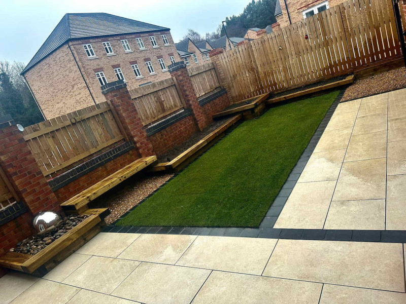 This recently completed garden in Oughtibridge, Sheffield combines sleek modern lines with natural wood planters and built in bench seat. "Gerusalem" Italian Porcelain tiles were laid to create an attractive paved terrace area. These were then edged using natural stone cobbles adding a nice detail to the finished patio.