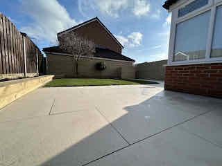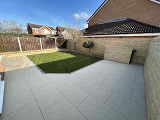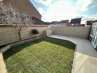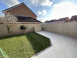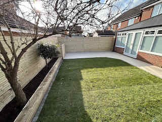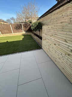 A recent garden makeover included the construction of a stunning porcelain paved terrace using "Rock Deck Crema Porcelain" slabs. Timber venetian screens were built along two sides of the boundary fence and an additional screen was included to act as a bin store. The garden was treated to a newly laid lawn and a timber raised planter along the left side.