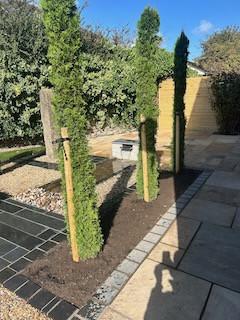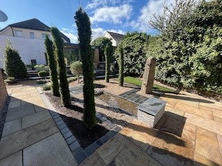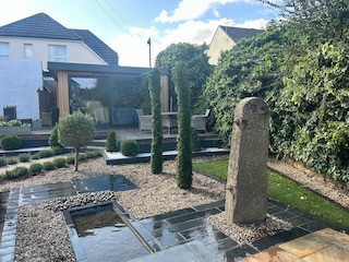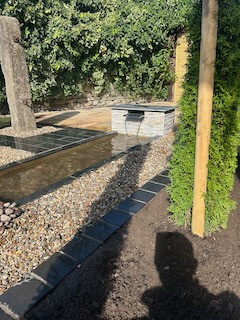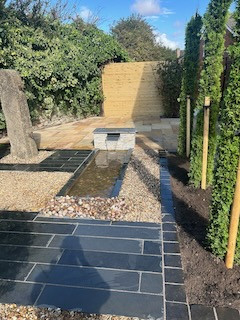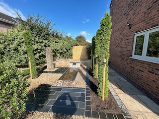 Italian Cypress trees will draw the eye throughout the garden to the top paved area. The trees will sit amongst a gravelled base punctuated with sections of Brazilian slate. A rill runS between the Cypress trees leading to the water feature sculpture.