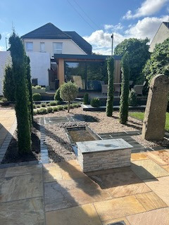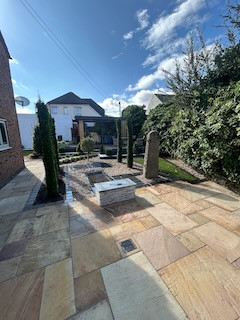 Original sandstone paving was extended in this garden to turn the original lawned area into a bigger terrace. Fossil Mint sandstone was used.
