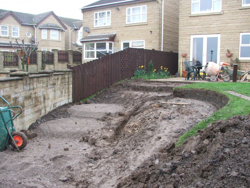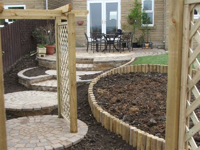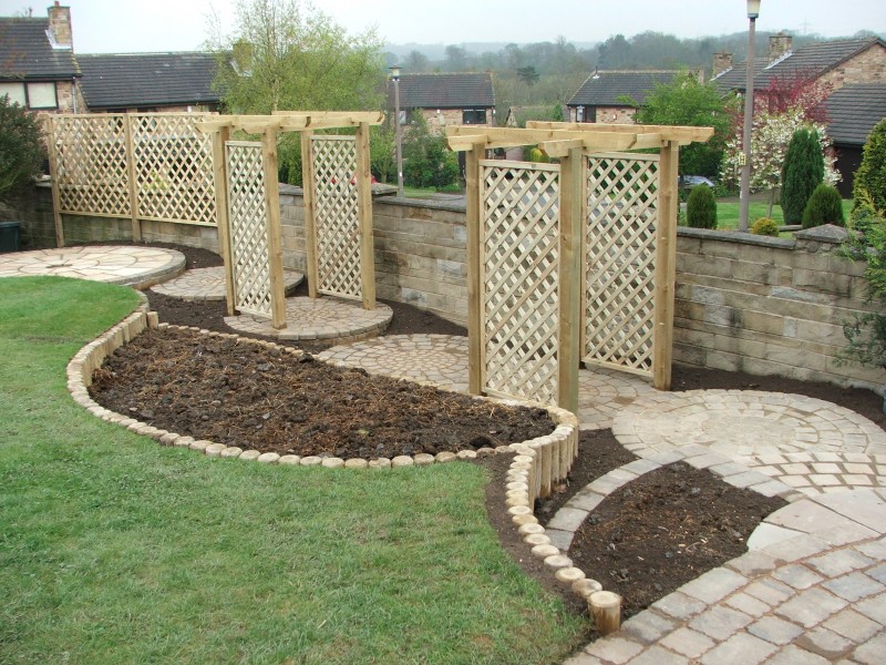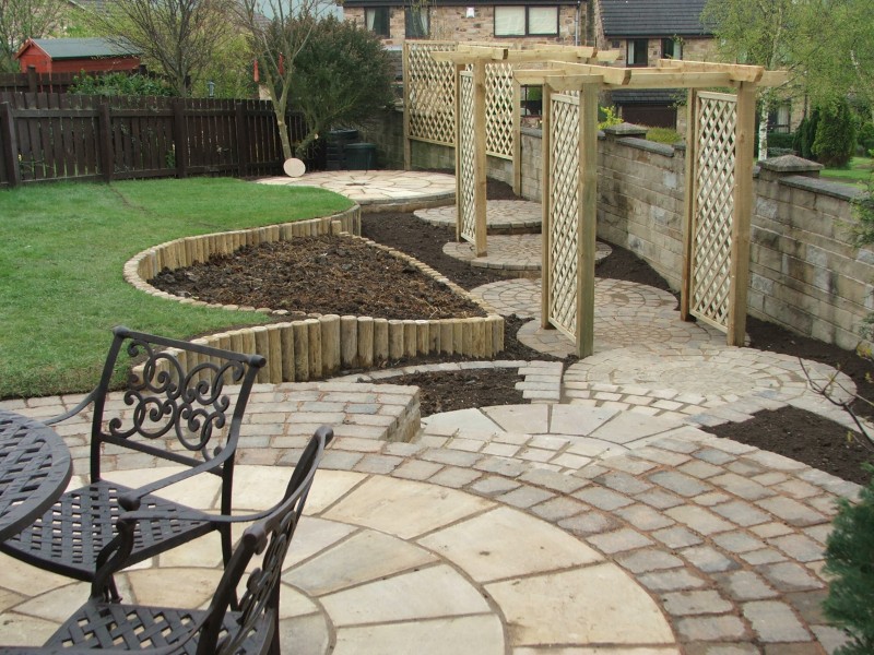 A main patio area was constructed directly outside the house using Indian sandstone paving and tegula cobbles. The paving featured a circular centre piece which then led onto a smaller area of radius paving. This in turn led onto several circular sections which formed a unique “walkway†linking the main eating area to the furthest point of the garden. Pergolas were erected along the walkway to add height and interest to the overall feel of the garden. Rounded posts were used as a retaining structure to compliment the sloping nature of the lawn.